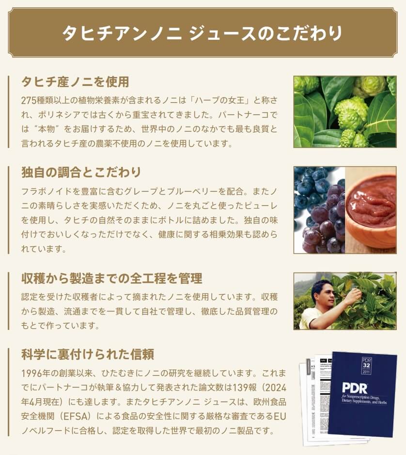 ご安心ください。当方からネットワークビジネスへお誘いすることはございません。日本ではマイナスイメージのネットワークビジネスですが、パートナーコ製品はとても素晴らしいです。だからこそロングセラーで広がっています。このサイトは【タヒチアン ノニの素晴らしさ】【パートナーコ製品のご紹介】【パートナーコ製品のご購入】【製造販売するパートナーコ・ジャパン合同会社】をお知らせしています。